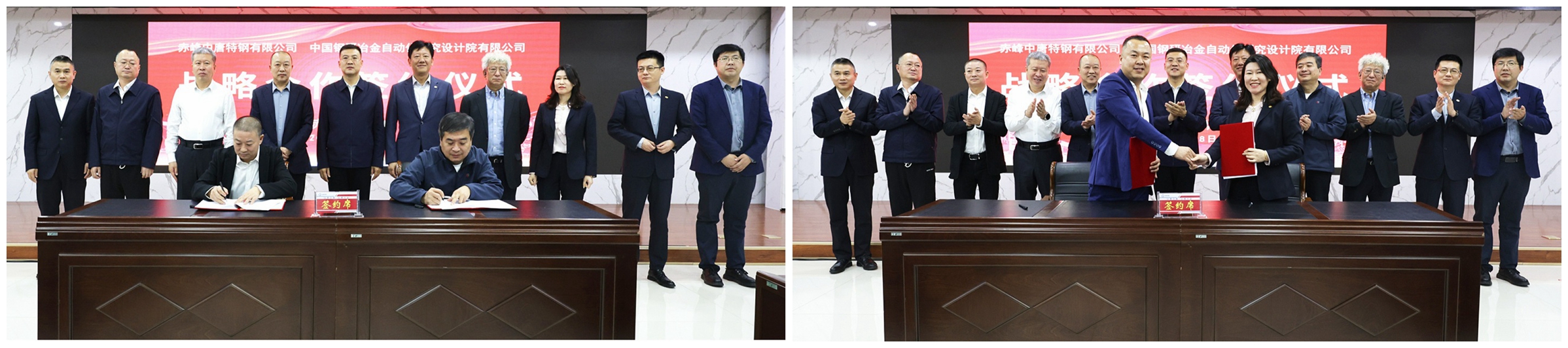 自動化院總經理楊光浩與中唐特鋼副董事長馬得紅代表雙方簽訂戰略合作協議。中國鋼研人工智能(工程)事業部(以下簡稱“智能部”)副總經理劉茹與中唐特鋼總經理助理馮蘭超簽訂《中唐特鋼全流程智能管控項目》合同。